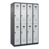Doppelstöckiger Spind Evolo PLUS mit hochwertiger Einbrennbeschichtung für hohe UV- und Korrosionsbeständigkeit. Geschlossene und abgeschrägte Seitenprofile für leichte Innenreinigung und komfortable Entnahme von Kleidung und Taschen. Geeignet für verdeckte Kabelführung. Mit hinteren Belüftungsöffnungen oben und unten. Innen je Fach 1 stabile Garderobenstange aus Ovalprofil mit 3 verdrehsicheren Doppel-Schiebehaken inkl. Systemaufnahme. Türöffnungsbegrenzer als Schutz vor Überdehnen der Tür. Türen rechts angeschlagen, mit Soft-Anschlag und geschlossenen Seitenprofilen für höchste Stabilität. Aufhängung in stabilen Drehbolzen. Ergonomische Sicherheits-Drehriegel für Vorhangschlösser mit Bügelstärke 6 bis 8 mm. Inkl. Tür-Schutz. Kunststoff-Etikettenrahmen, schwarz, selbstklebend, inkl. Klarsichtkunststoff-Abdeckung und weißem Etikett zur individuellen Beschriftung. Achtung: Anlieferungsmöglichkeit durch Sattelschlepper muss gegeben sein.